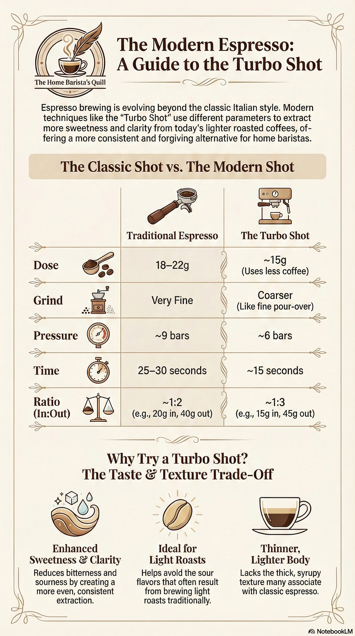 This Turbo Shot espresso infographic shows how a low-pressure turbo shot recipe uses less coffee and faster extractions to highlight sweeter, brighter light-roast flavors, helping home baristas reduce bitterness and dial in more consistent, modern espresso at home.